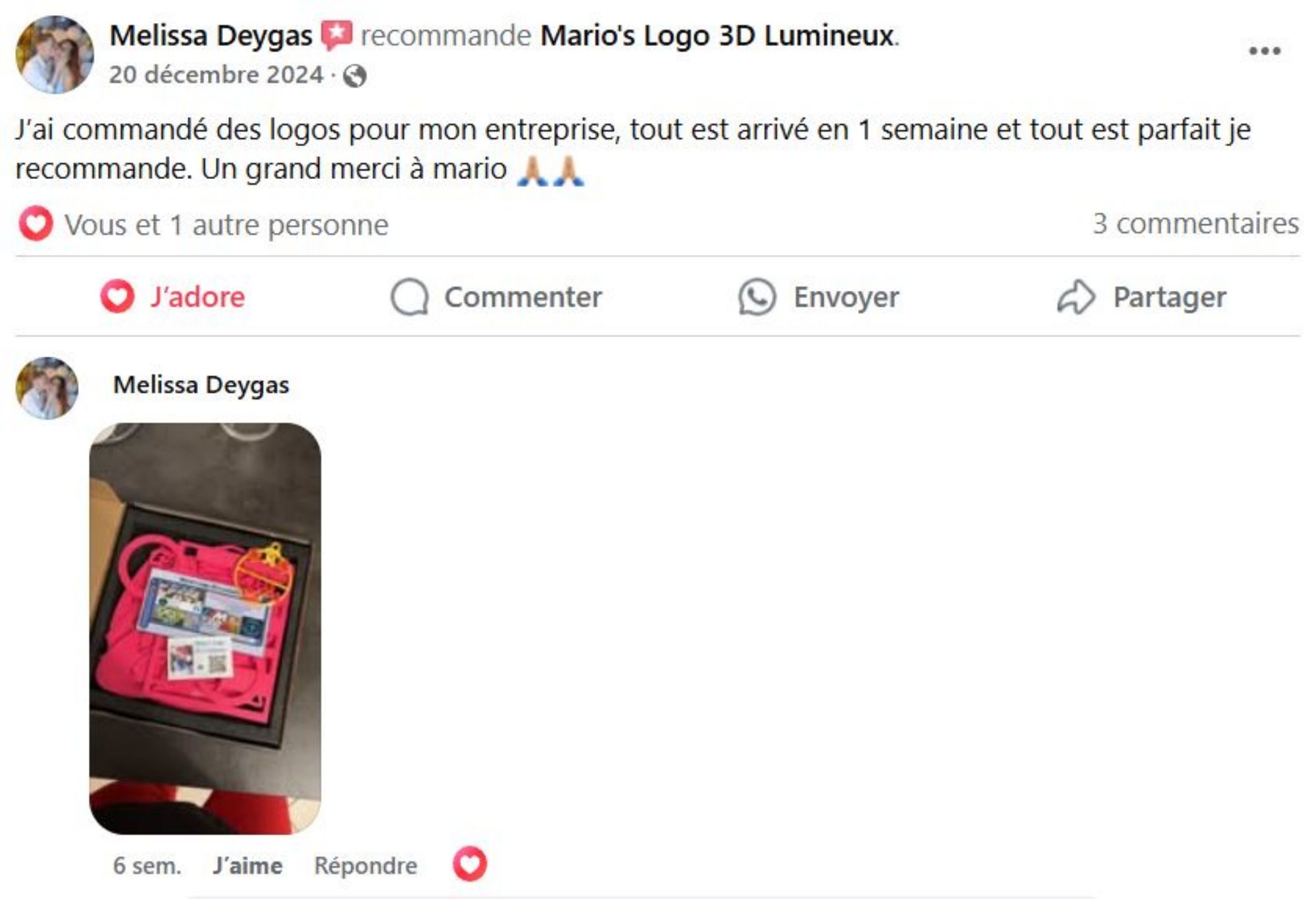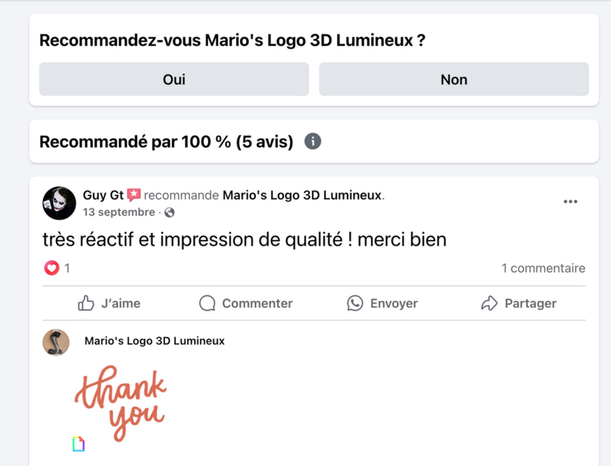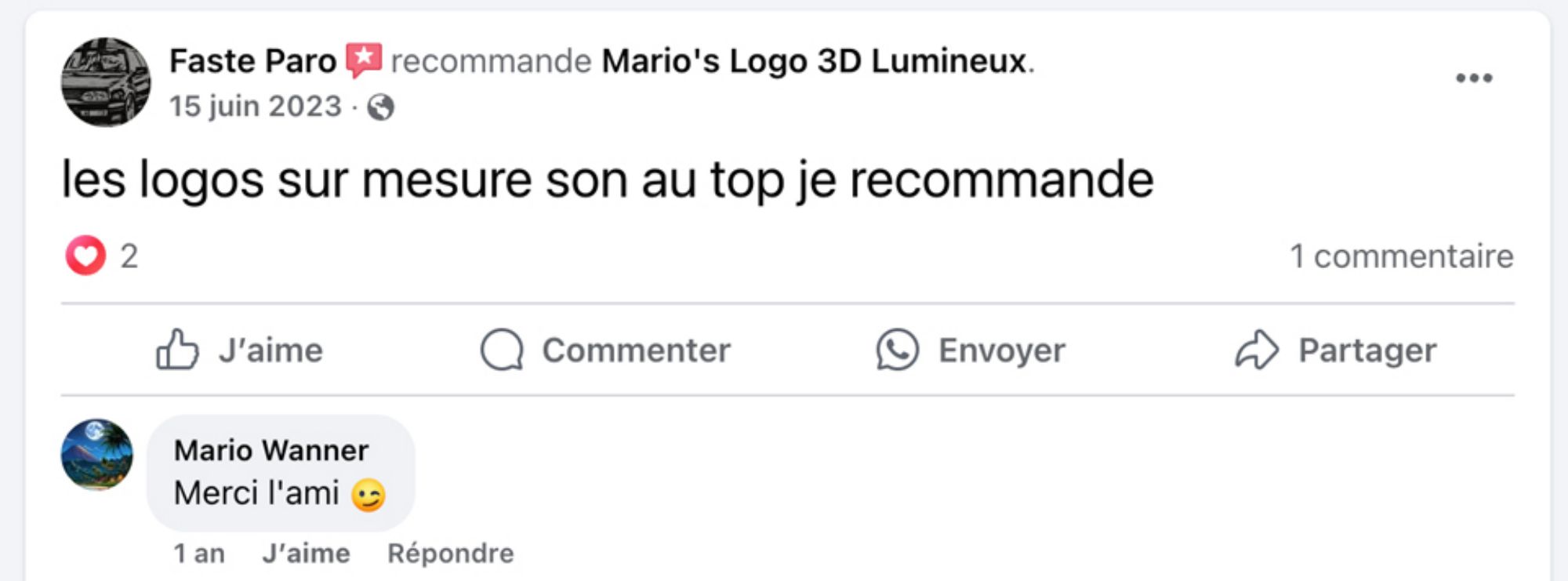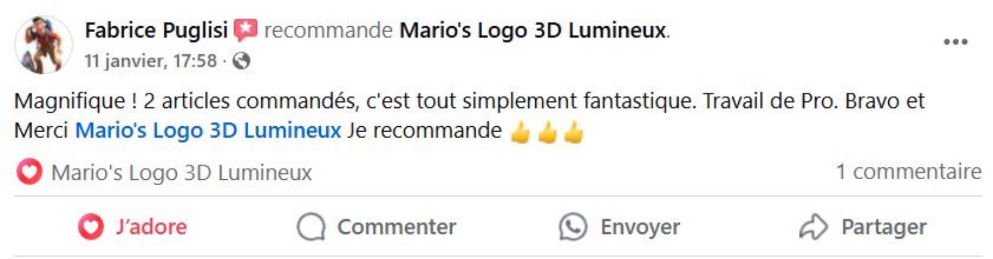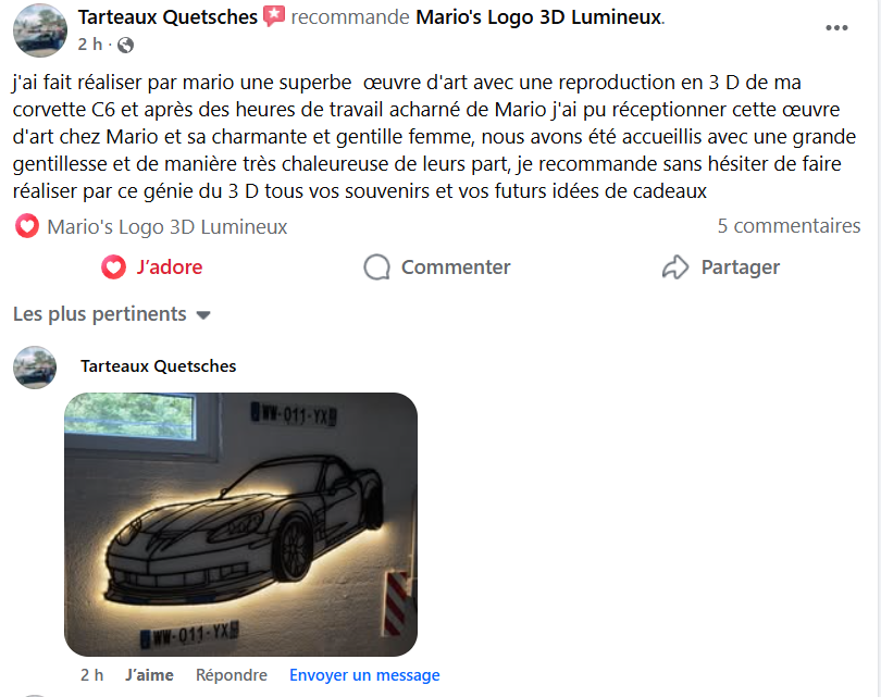 Je m'appelle Franck d'Infonumerique, et je tiens à souligner l'excellent professionnalisme de Mario. Sa maîtrise de l'impression 3D et son souci du détail. Les créations lumineuses qu'il réalises sont non seulement innovantes mais aussi parfaitement adaptées aux besoins personnel. Je recommande vivement ses services à tous ceux qui recherchent qualité et professionnalisme.