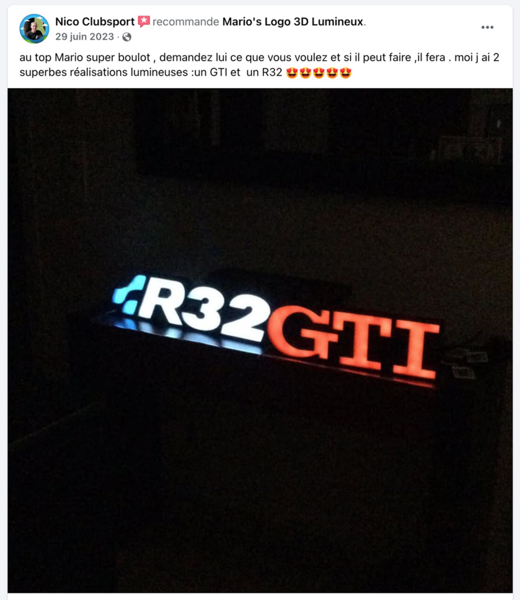 au top Mario super boulot , demandez lui ce que vous voulez et si il peut faire ,il fera . moi j ai 2 superbes réalisations lumineuses :un GTI et un R32